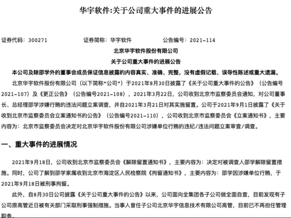 9月21日晚间,华宇软件公告,2021年9月18日,公司收到北京市监察委员会《解除留置通知书》,主要内容为:决定对被调查人邵学解除留置措施。同时,公司了解到邵学家属收到北京市海淀区人民检察院《拘留通知书》,主要内容为:邵学因涉嫌单位行贿,于2021年9月18日被刑事拘留。