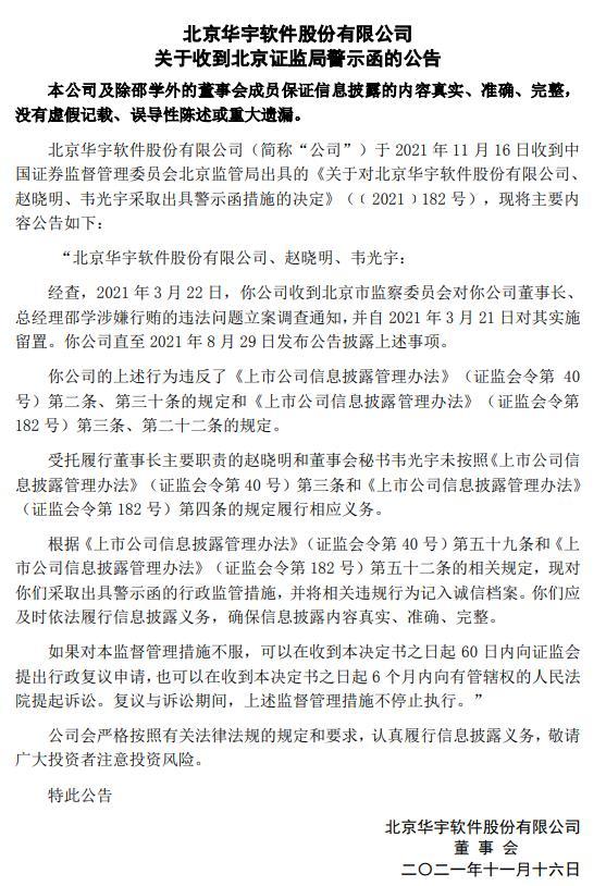 北京证监局表示,根据《上市公司信息披露管理办法》和《上市公司信息披露管理办法》相关规定,现对北京华宇软件股份有限公司采取出具警示函的行政监管措施,并将相关违规行为记入诚信档案。