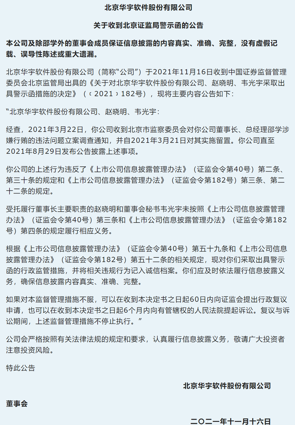 扬子晚报/紫牛新闻记者据Wind查询发现,11月16日晚间,北京华宇软件股份有限公司(简称“华宇软件”)发布关于收到北京证监局警示函的公告。据公告,公司于2021年11月16日收到北京证监局出具的《关于对北京华宇软件股份有限公司、赵晓明、韦光宇采取出具警示函措施的决定》(﹝2021﹞182号)。