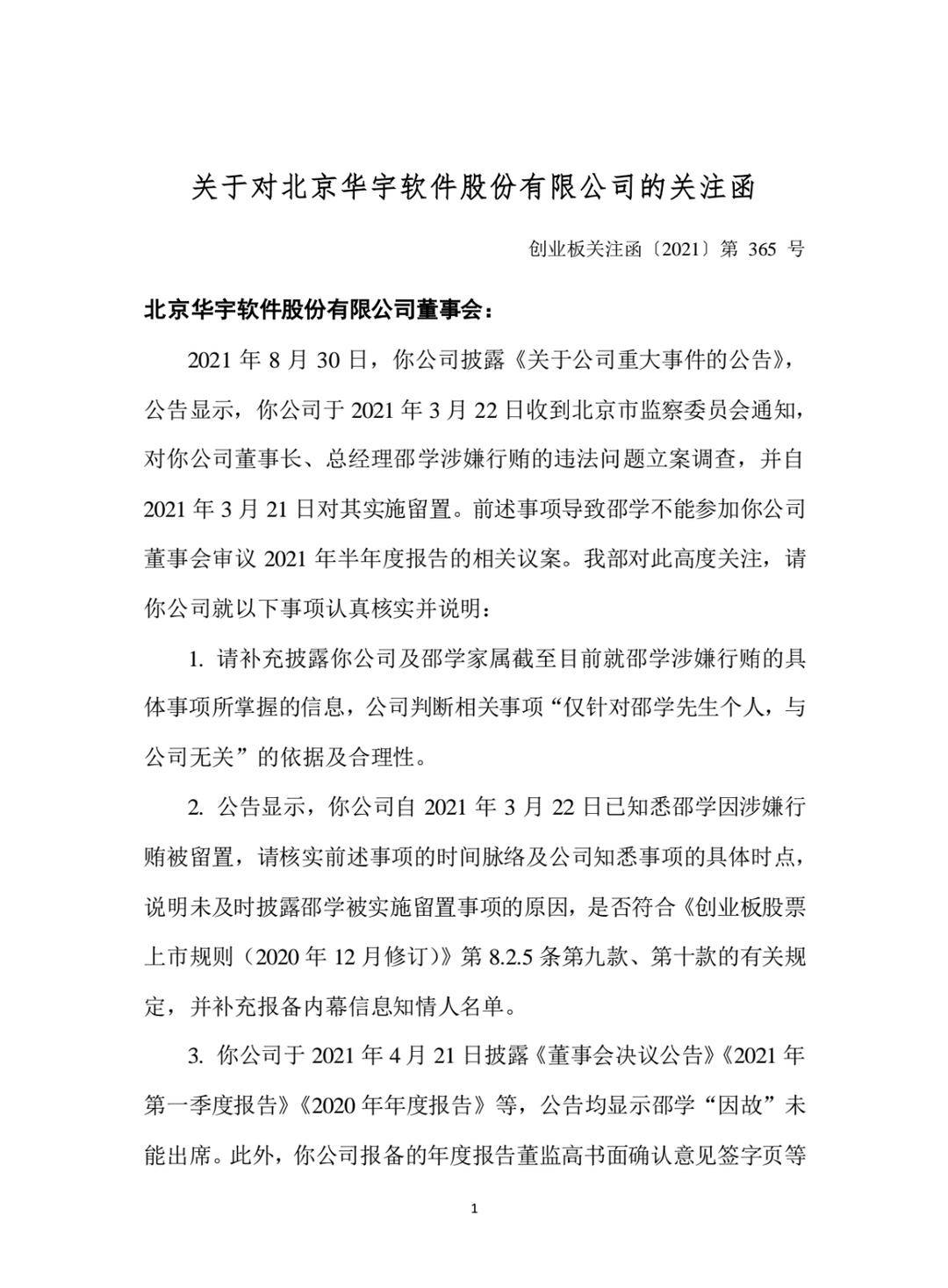 2021年8月30日,华宇软件发布公告称,公司未收到董事长邵学先生关于2021年半年度报告相关议案的意见,邵学将不能在董事会履行董事职责。公告称,早在2021年3月22日公司就收到北京市监察委员会通知,对公司董事长、总经理邵学涉嫌行贿的违法问题立案调查,并自2021年3月21日对其实施留置。