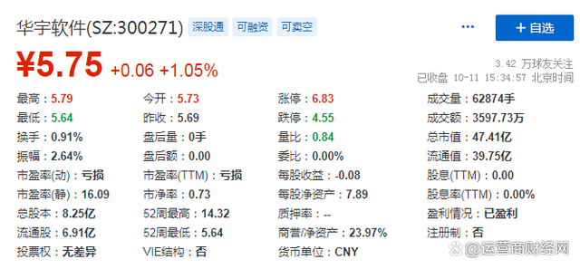 此事件一度使得华宇软件本就走低的股价出现断崖式下跌,截至目前华宇软件的股价只有5.75元/股,总市值为47.41亿。