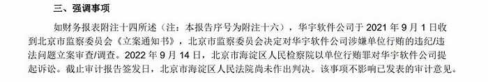 在2022年度审计报告中显示,在收到《立案通知书》一年之后,2022年9月14日,检察院以单位行贿罪对华宇软件提起诉讼,截止审计报告签发日,法院尚未作出判决。