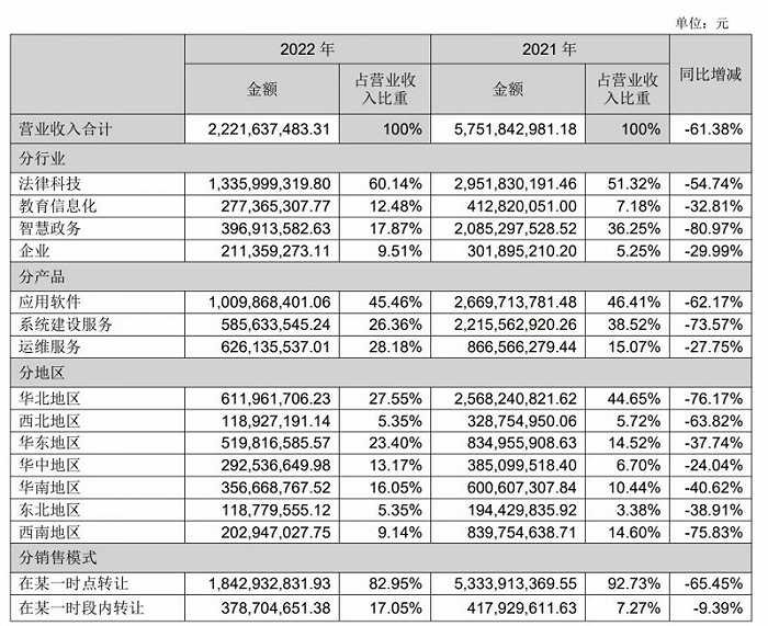 营业收入按行业分,法律科技、教育信息化、智慧政务、企业所对应的收入分别为13.36亿元、2.77亿元、3.97亿元和2.11亿元,和2021年的收入相比,分别减少了54.74%、32.81%、80.97%、29.99%,各业务收入全部出现了大幅下降。