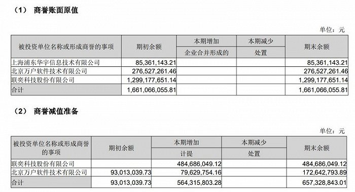 华宇科技收购联奕科技、万户软件和上海浦东华宇信息技术有限公司(以下简称“浦东华宇”)所形成的商誉账面原值合计16.61亿元,2022年年末账面价值剩下10.04亿元。截至2022年年末,已经对收购联奕科技、万户软件形成的商誉计提了6.57亿元的商誉减值准备,占两者商誉账面原值合计额的41.72%。
