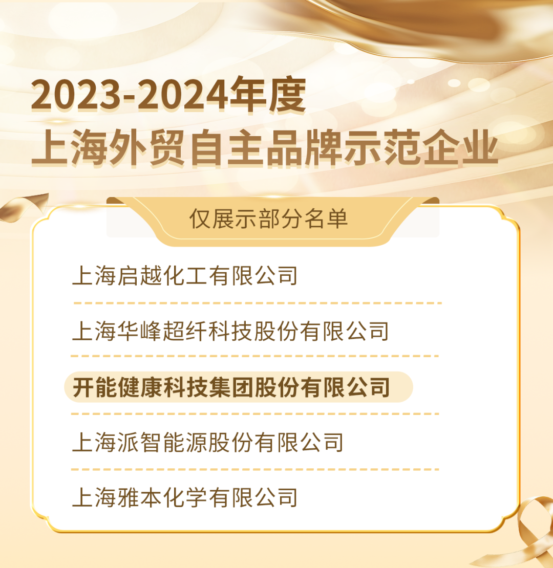 近日,“2023-2024年度上海外贸自主品牌示范企业”名单正式公布。开能健康科技集团股份有限公司(以下简称“开能健康”)凭借强劲实力再次成功入选,这也是其连续第三次获此殊荣,彰显了企业在技术创新、产品多元化和国际市场拓展方面的卓越成就。