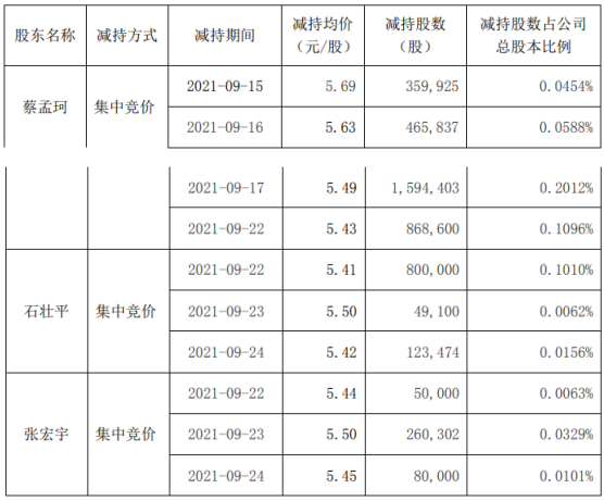 公告显示,减持前蔡孟珂、石壮平、张宏宇分别持有公司股份78,111,543股、3,737,297股、1,561,207股,分别占公司普通股总股本9.8582%、0.4717%、0.1970%,本次减持后分别持有股份74,822,778股、2,764,723股、1,170,905股,分别占公司普通股总股本比例为9.4431%、0.3489%、0.1478%。