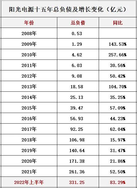 据笔者统计,过去十几年间阳光电源总负债规模也一直保持较快速增长,已总负债规模已由2008年的0.53亿元增长至2022年6月末的331.25亿元,增长了624倍倍,这远远高于同期总资产300.89倍的增幅。