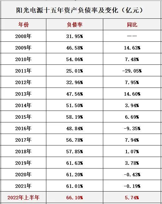 与此同时,十几年间,阳光电源资产负债率也由2008年的31.95%增至2022年6月末的66.10%。