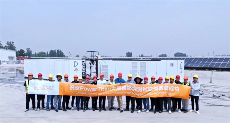 本次燃烧测试,由阳光电源4台PowerTitan真机组成,实景模拟电站搭建。在全球众多客户全程直播见证下,阳光电源主动燃爆了一台PowerTitan储能系统真机,经过4小时燃烧火势无蔓延,最终储能柜仍能保持结构完整性。