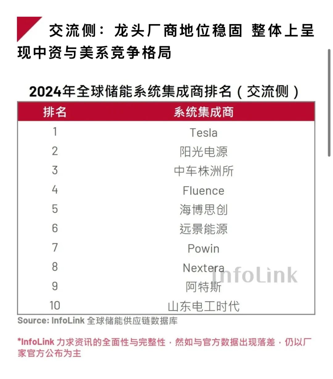 在行业机构InfoLink公布的2024年全球储能系统集成商(交流侧)排名前十中,阳光电源位列第二。据悉,阳光电源去年还发布了首款面向10/20kV大工业场景的工商业液冷储能系统PowerStack 835CS,引领工商业储能迈入场景化定制时代。