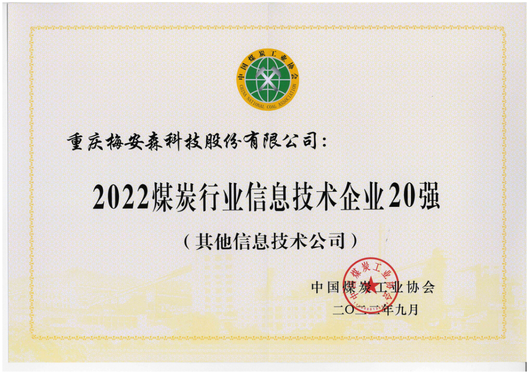 经过中国煤炭工业协会对全国服务煤炭产业数字化发展的各类信息技术企业进行专项调研评比,重庆梅安森科技股份有限公司成功入选“2022煤炭行业信息技术企业20强”,并获得荣誉证书。