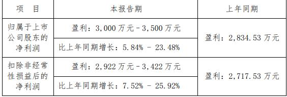 据公司7月16日披露的《2024年半年度业绩预告》,2024年1月1日至2024年6月30日,公司归属于上市公司股东的净利润预计盈利3,000万元至3,500万元,比上年同期增长5.84%至23.48%,上年同期盈利2,834.53万元;扣除非经常性损益后的净利润预计盈利2,922万元至3,422万元,比上年同期增长7.52%至25.92%,上年同期盈利2,717.53万元。
