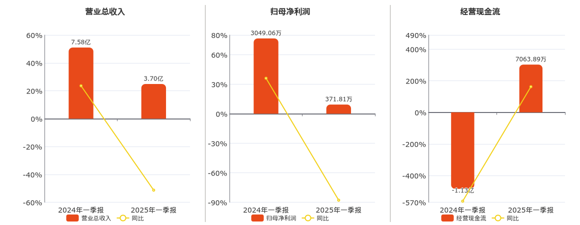 公司营业总收入为3.70亿元,较去年同报告期营业总收入减少3.89亿元,同比较去年同期下降51.27%。归母净利润为371.81万元,较去年同报告期归母净利润减少2677.25万元,同比较去年同期下降87.81%。经营活动现金净流入为7063.89万元,较去年同报告期经营活动现金净流入增加1.84亿元。