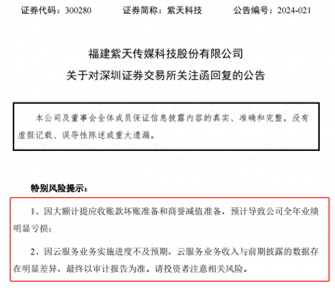该公司在力证自身不存在问题的同时,又似乎有些矛盾地提出,因大额计提应收账款坏账准备和商誉减值准备,预计导致公司全年业绩明显亏损;因云服务业务实施进度不及预期,云服务业务收入与前期披露的数据存在明显差异,最终以审计报告为准。
