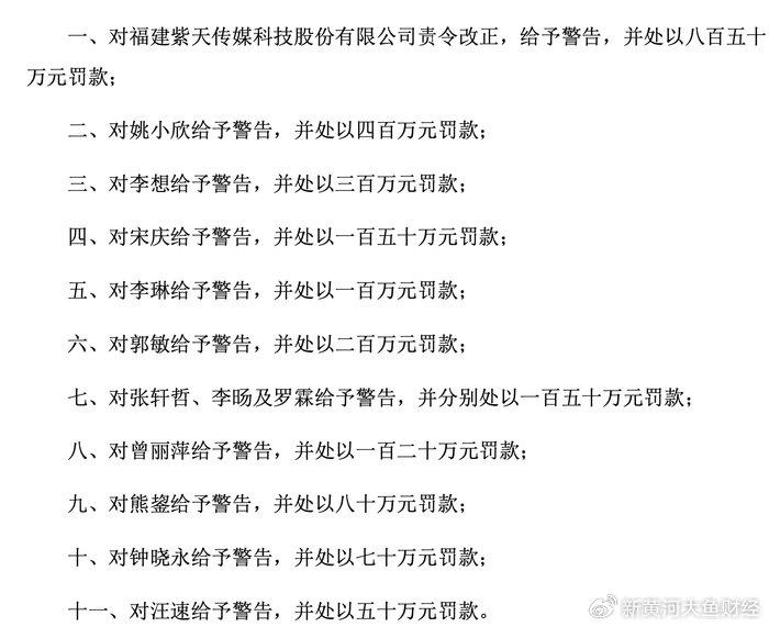 中国证券监督管理委员会对紫天科技责令改正,给予警告,并处以850万元罚款。对姚小欣处以400万元罚款,李想罚款300万元,李琳罚款100万元。另外还有七名相关人员被罚款50万元至200万元不等。