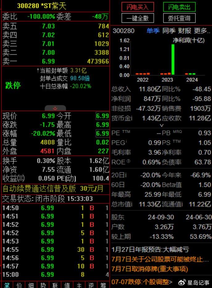 7月7日,*ST紫天(300280.SZ)公告表示因未能按时披露2024年年报且停牌期满后仍未补救,该股于当日复牌,并被深圳交易所叠加实施退市风险警示。7月7日,*ST紫天一字跌停,收报6.99元/股。停牌前,该股于3月14日收于8.74元,一季度跌幅高达58.58%,较去年底收盘价21.10元减少12.36元。最新市值为11.33亿元。