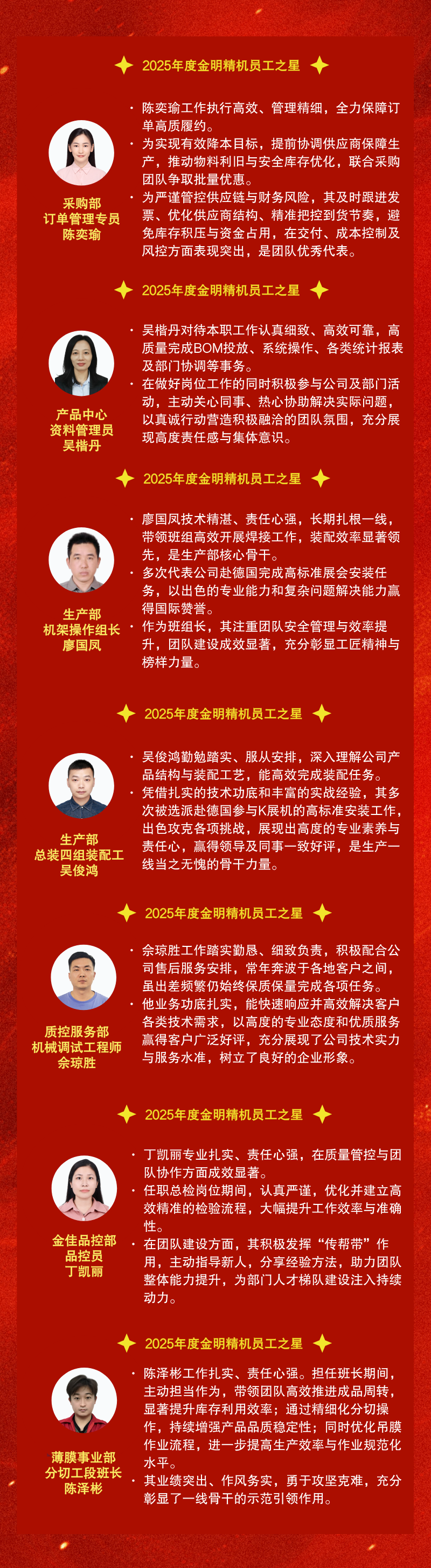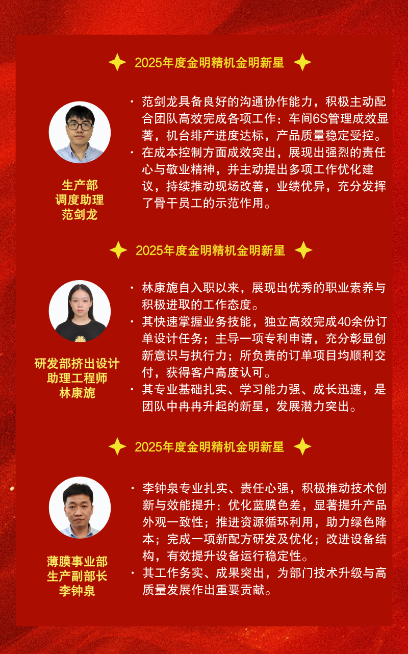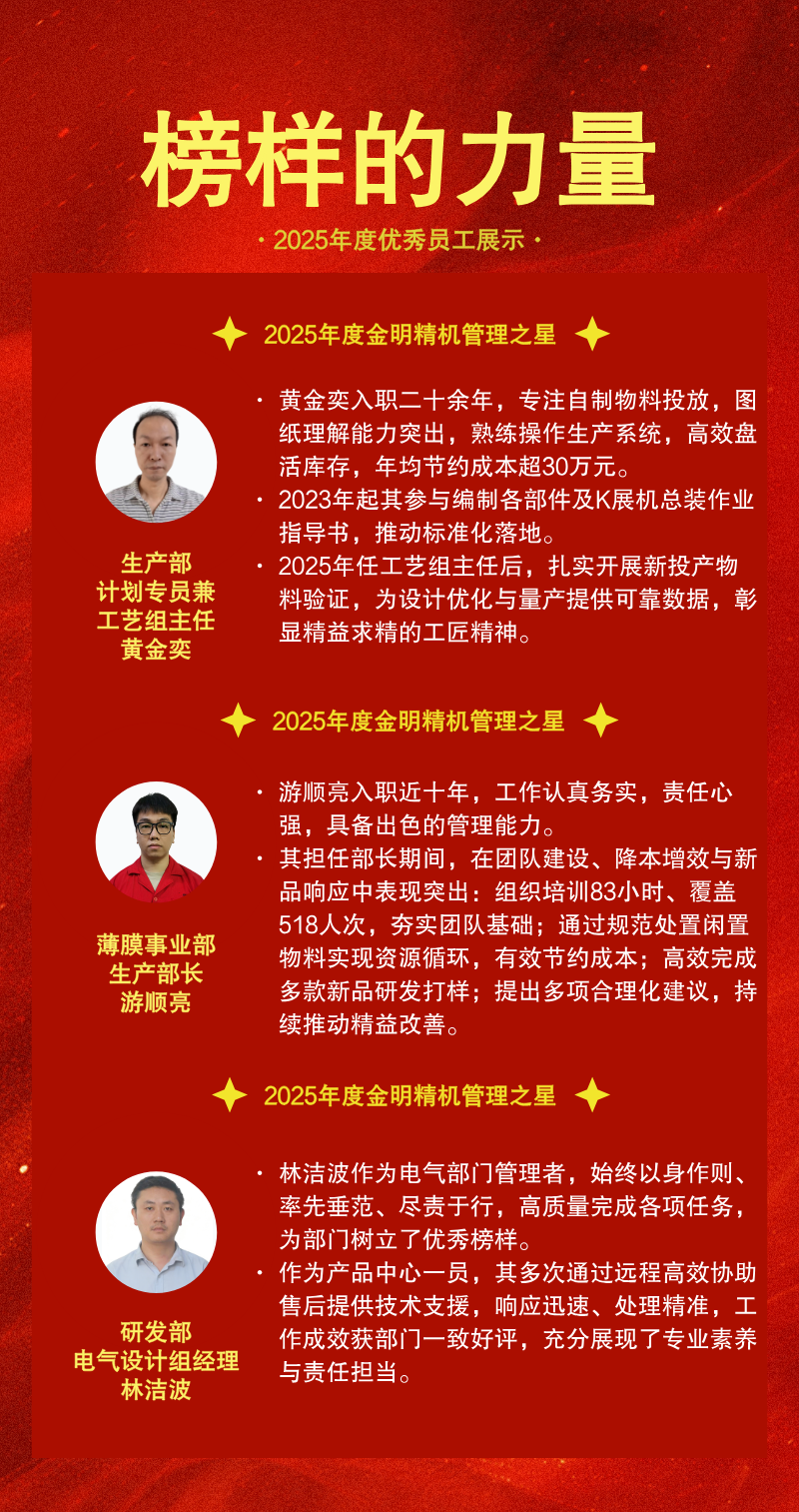 2025年度金明精机优秀员工评选活动已圆满落幕,十三位优秀员工脱颖而出,他们积极进取、勤勉敬业,在各自的岗位上熠熠生辉,成为新一年鼓舞人心的榜样、催人奋进的力量。见贤思齐,让我们一同回顾他们的优秀事迹。