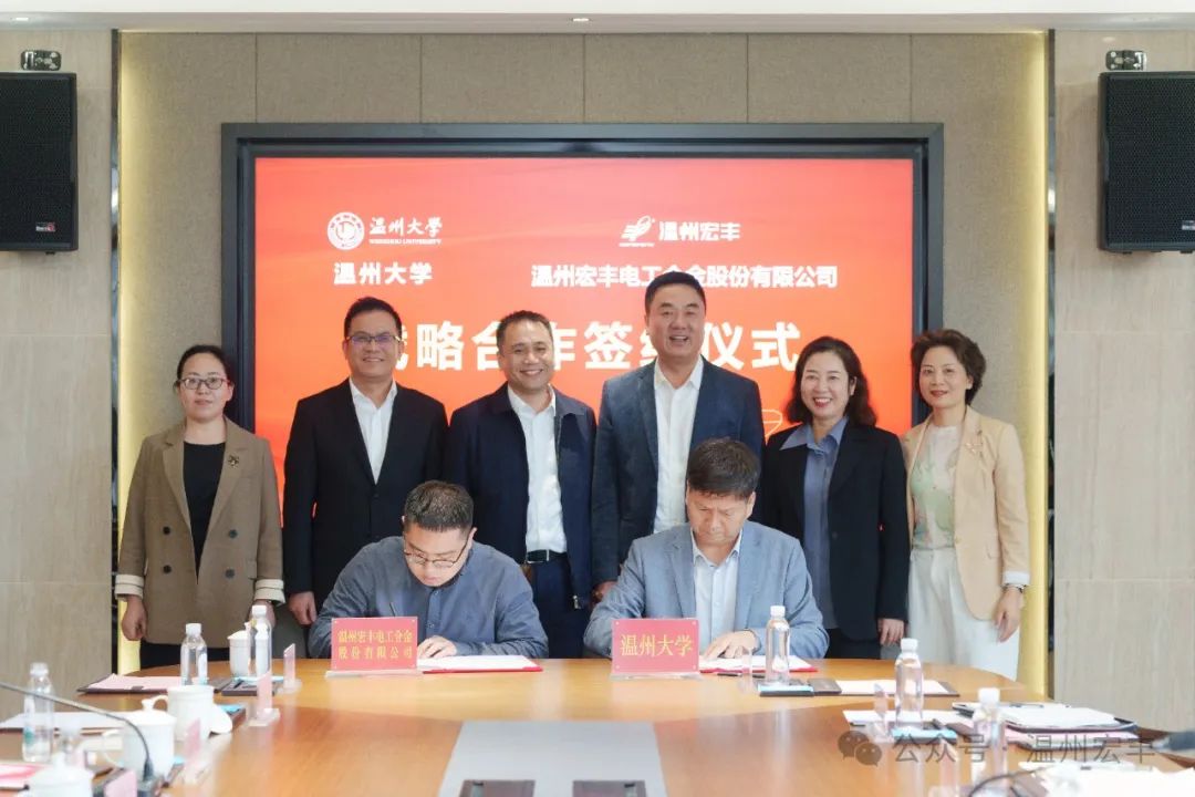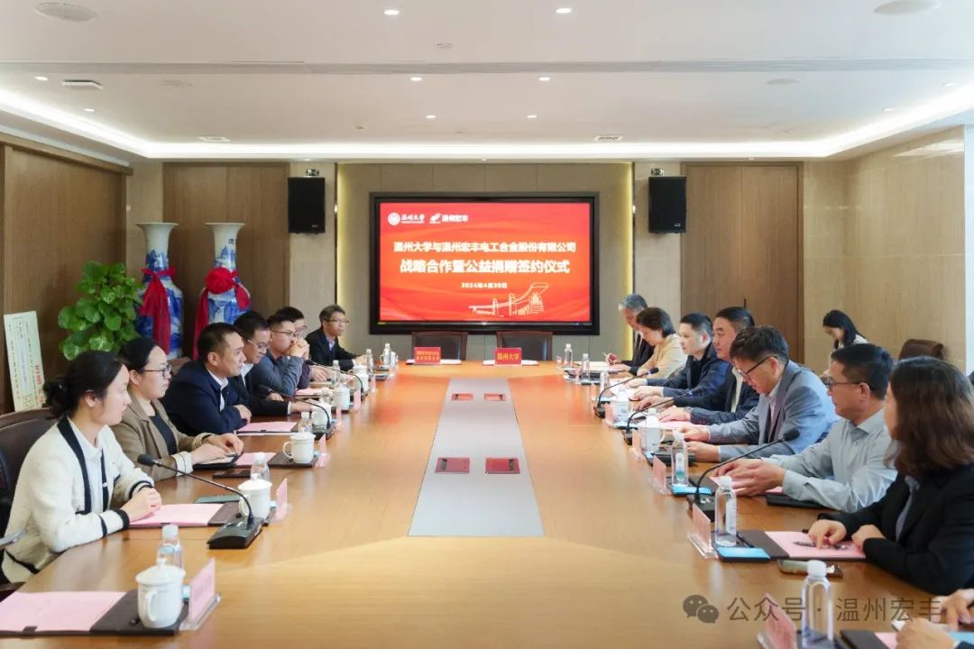 为进一步深化校企合作,促进产教融合协同育人,4月30日下午,温州宏丰与温州大学战略合作暨公益捐赠签约仪式在温州大学举行。温州大学党委书记钱强、党委副书记庄兴忠,温州宏丰董事长兼总裁陈晓、董事严学文、樊改焕、陈林驰等公司领导出席,双方相关部门负责人参会。