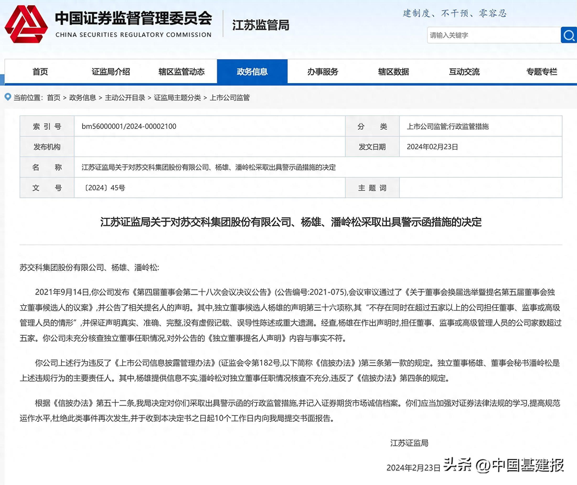 江苏证监局关于对苏交科集团股份有限公司、杨雄、潘岭松采取出具警示函措施的决定