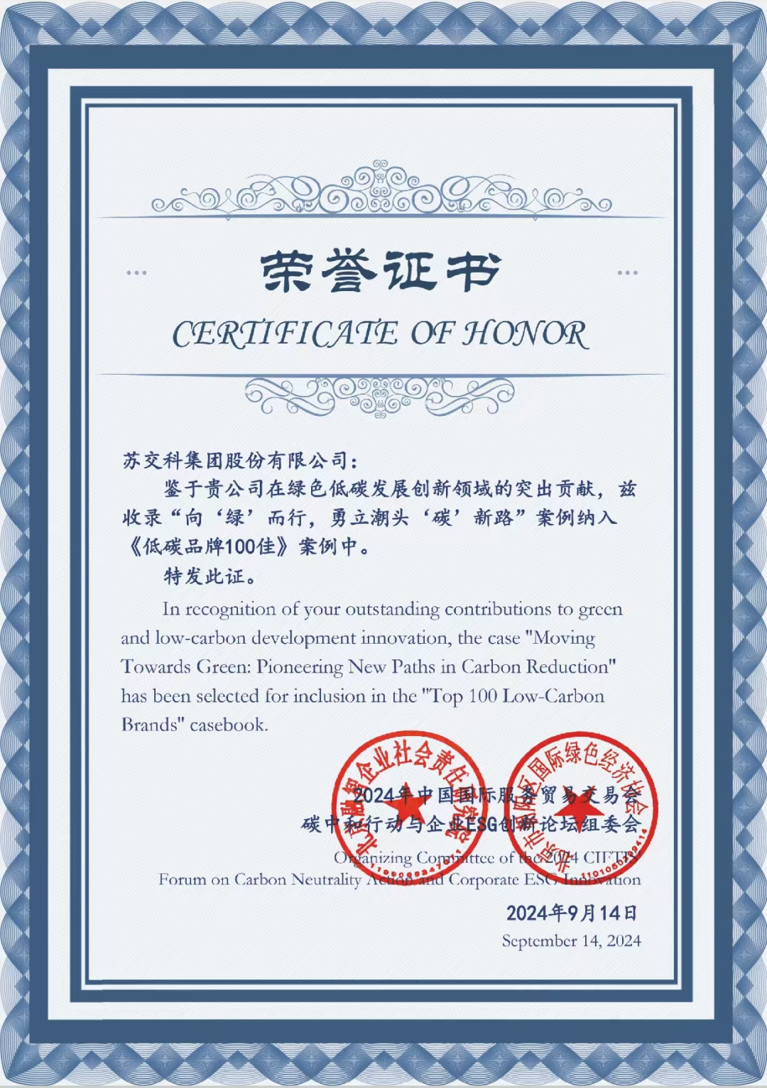 此次论坛还重磅发布了《低碳品牌100佳》案例,该案例集聚焦企业绿色低碳发展创新实践遴选典型案例,旨在推广企业践行可持续发展优秀经验,打造示范效应。凭借在绿色低碳发展创新领域的突出贡献,苏交科“向‘绿’而行,勇立潮头‘碳’新路”案例被纳入《低碳品牌100佳》案例。