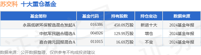 持有苏交科最多的基金为永赢低碳环保智选混合发起A,目前规模为0.82亿元,最新净值0.8148(4月15日),较上一交易日下跌0.32%,近一年上涨31.76%。该基金现任基金经理为胡泽。