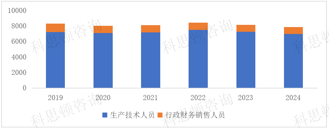2019-2024年,生产技术人员占员工总数的比例从2019年的86.5%增至88.6%。行政销售财务这三类人员数量逐年减少,其占员工总数的比例从2019年的13.5%降至2024年的11.4%。