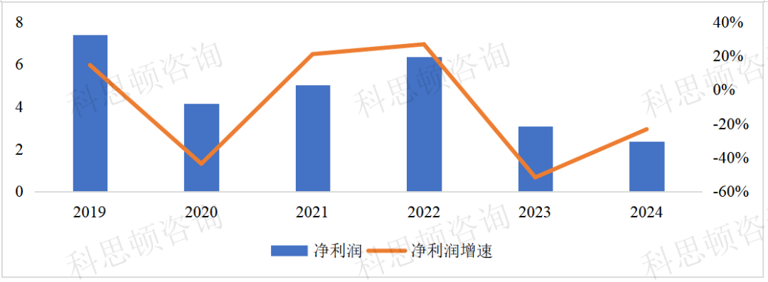 净利润近年来呈波动下降态势,增速波动性较大,2020年、2023降幅超40%,2021和2022年增幅在20%以上。2024年净利润为2.35亿元,同比下降23.4%。