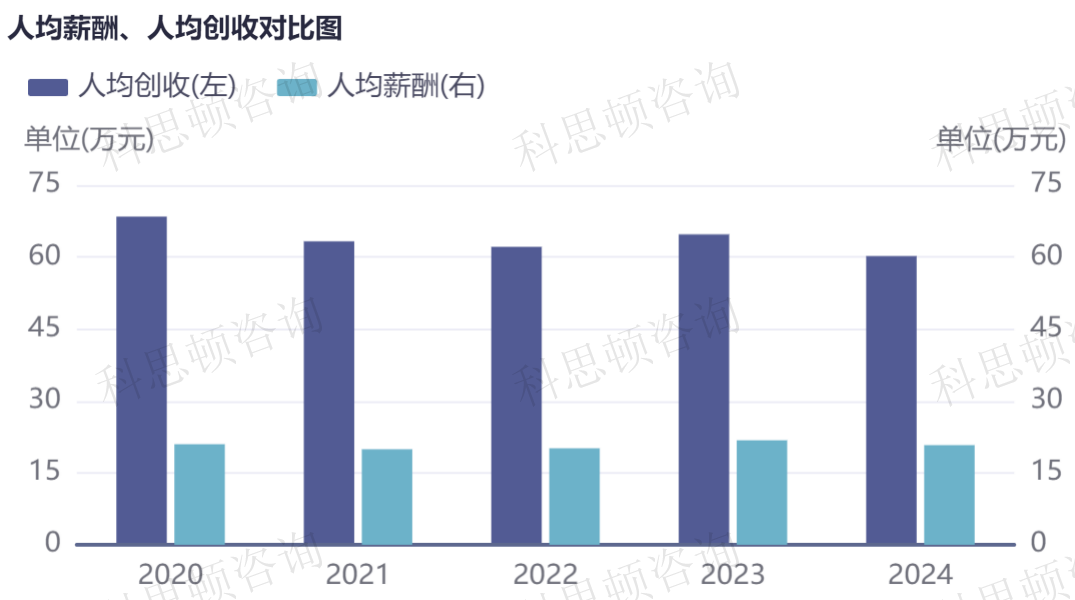 据科思顿研究院统计分析,近年来苏交科人均薪酬呈先下降后上涨态势,年均复合增长率为-1%。2019年为21.12万元,2020、2021年连续两年降至20万元以下,2022年同比涨2.5%,2023年涨5.4%至21.2万元,回到了2019年的薪酬水平。2024年再度下降5.3%,人均薪酬降至20.1万。