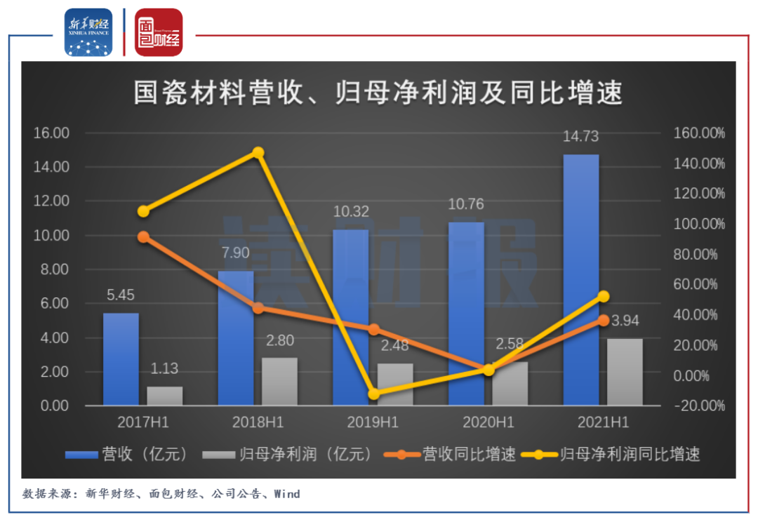 2021年上半年,国瓷材料实现营收14.73亿元,同比增长36.94%;实现归母净利润3.94亿元,同比增长52.68%。营收、归母净利润增速均较受疫情影响的2020年同期有明显加快。