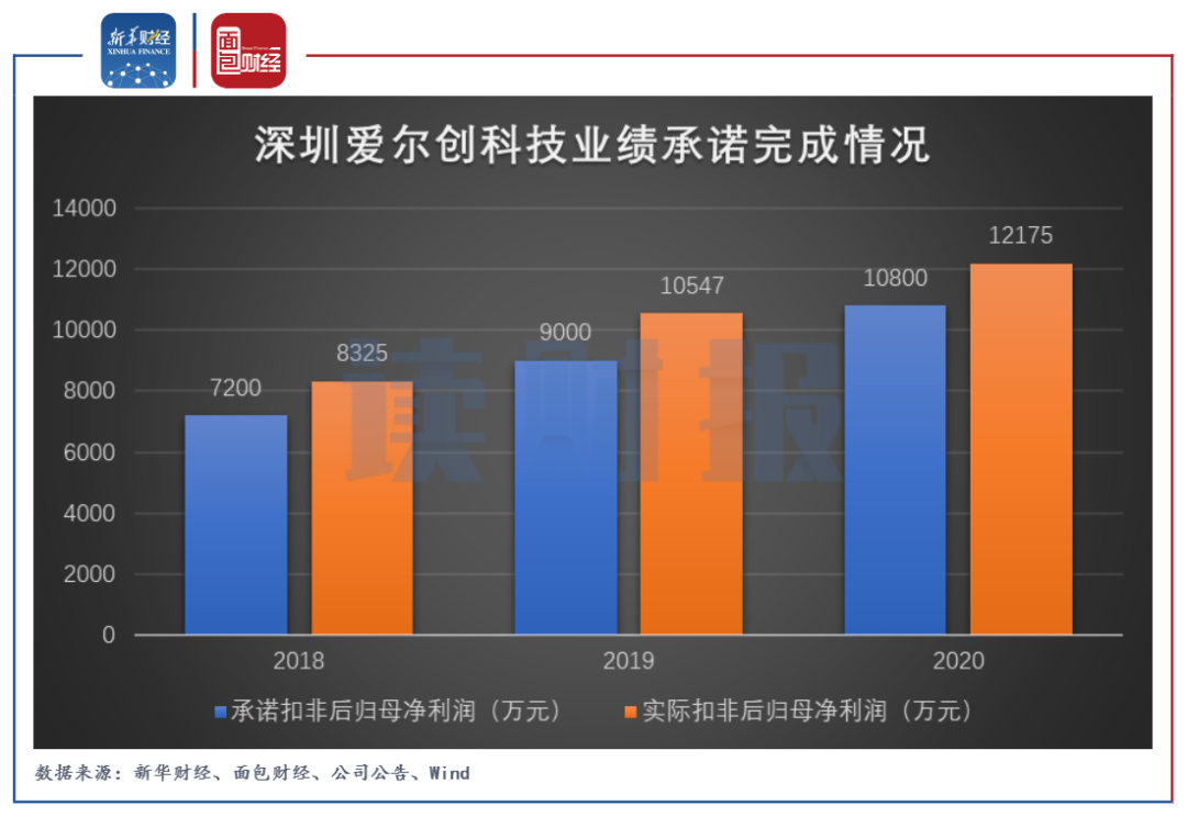 深圳爱尔创科技的业绩承诺为2018年、2019年、2020年的扣非后归母净利润分别不低于7200万元、9000万元和10800万元,最终均如期完成。2021年上半年,深圳爱尔创科技实现营收3.22亿元、净利润0.94亿元。