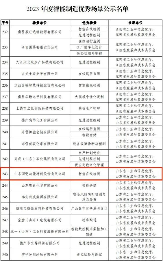 近日,工业和信息化部公示了2023年度智能制造优秀场景名单,山东国瓷功能材料股份有限公司的“智能在线检测”成功入选优秀场景名单,这是获得国家级绿色工厂的又一项荣誉。