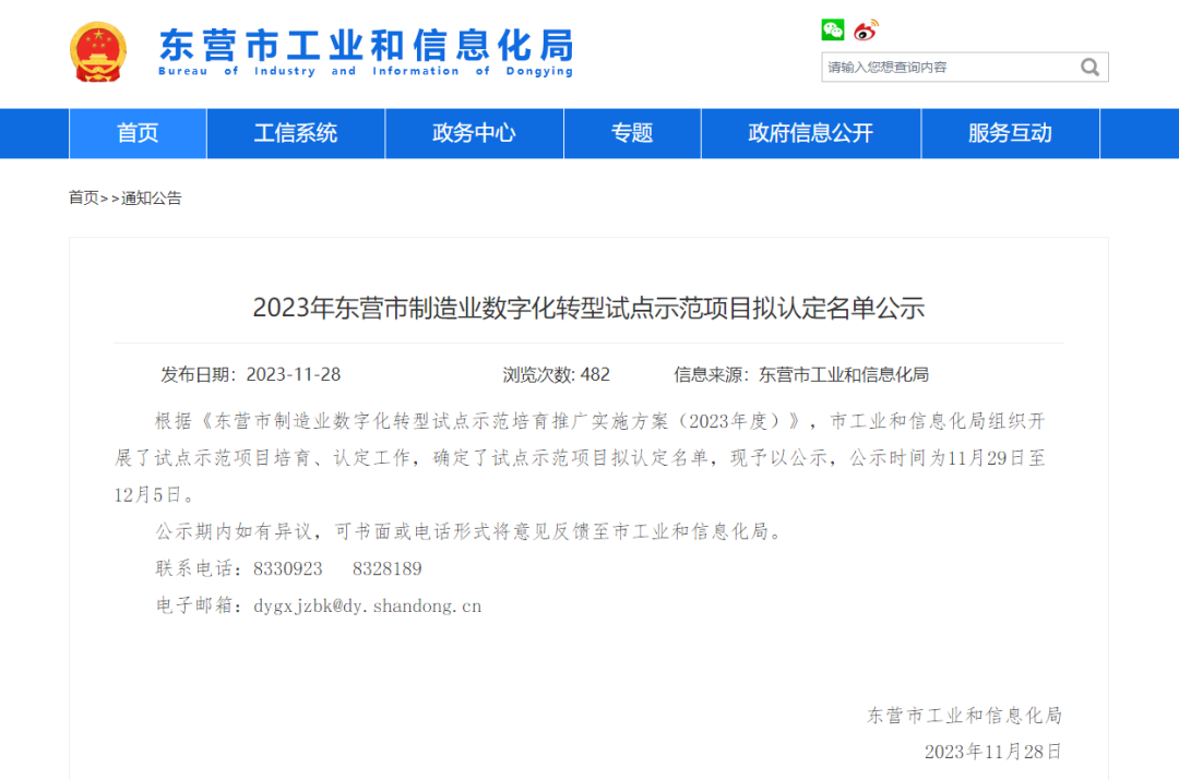 11月28日,市工信局公示了2023年东营市制造业数字化转型试点示范项目拟认定名单,山东国瓷功能材料股份有限公司入选全市制造业“数字化车间。