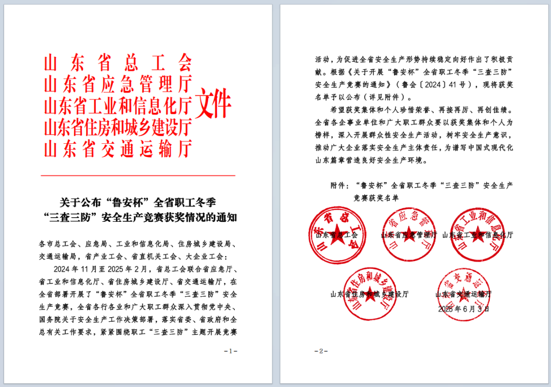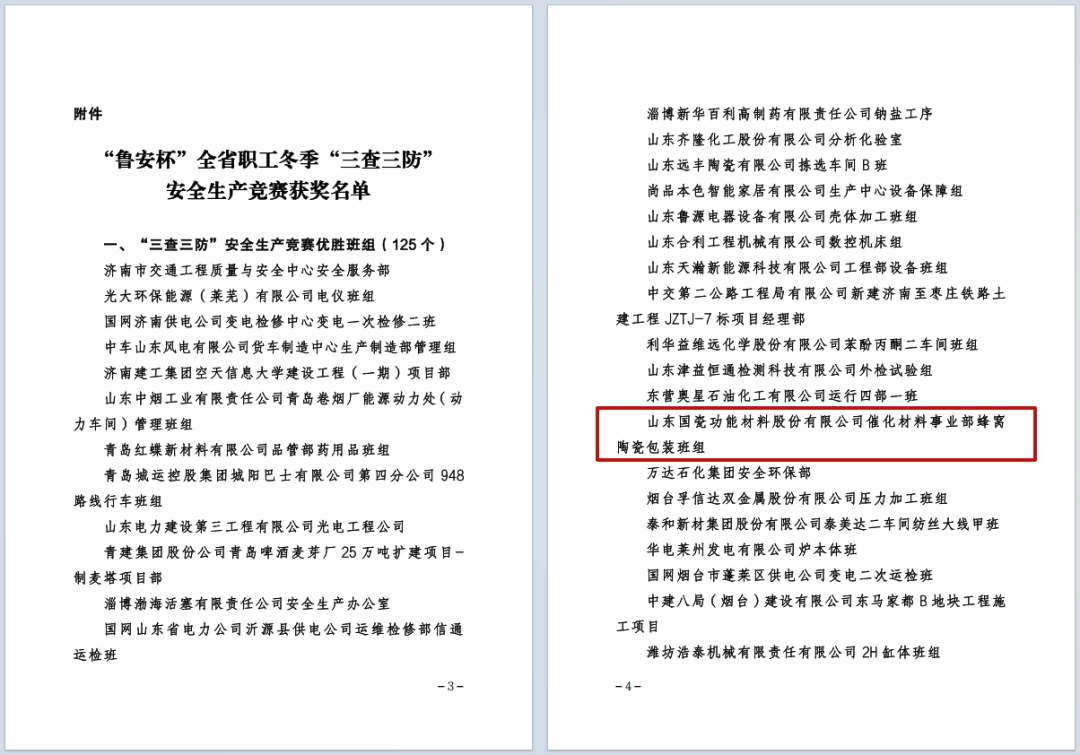 2024年11月至2025年2月,山东省总工会联合省应急厅、省工业和信息化厅、省住房城乡建设厅、省交通运输厅,在全省部署开展了“鲁安杯”全省职工冬季“三查三防”安全生产竞赛。6月5日,公司催化材料事业部蜂窝陶瓷包装班组凭借扎实的安全管理措施,荣获“三查三防”安全生产竞赛优胜班组。
