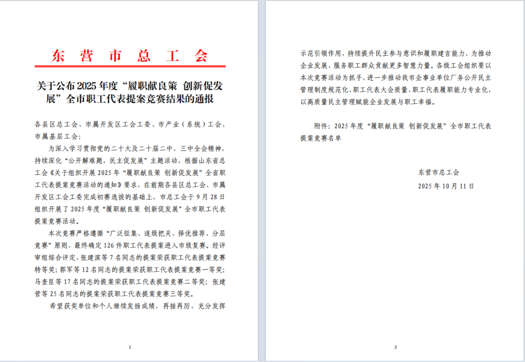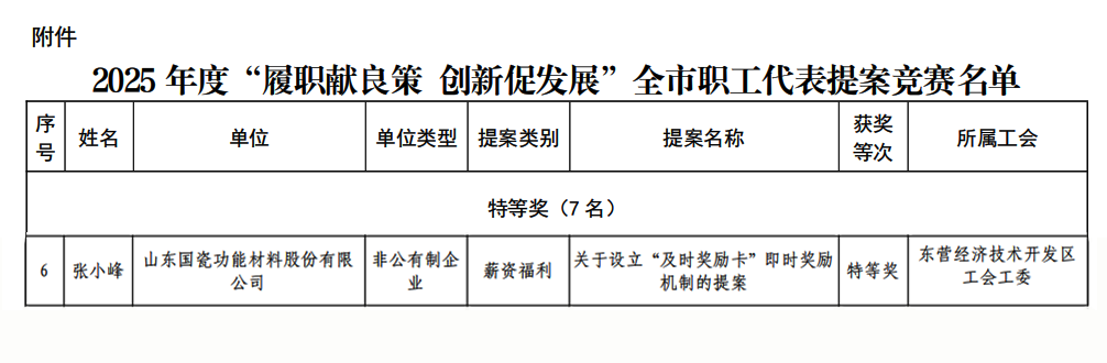 10月11日,东营市总工会公布了 2025 年度“履职献良策创新促发展”全市职工代表提案竞赛结果,其中61件优秀职工代表提案获得表彰。国瓷工会提报的《关于设立“及时奖励卡”即时奖励机制的提案》荣获特等奖。