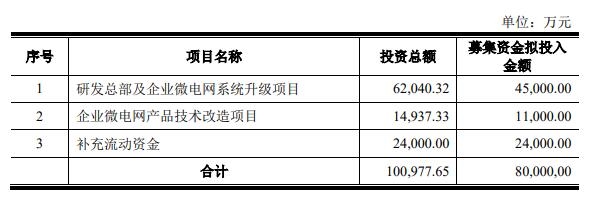 本次向特定对象发行股票募集资金总额不超过8亿元(含本数),扣除发行费用后的募集资金净额拟4.5亿元用于研发总部及企业微电网系统升级项目、1.1亿元用于企业微电网产品技术改造项目、2.4亿元补充流动资金。