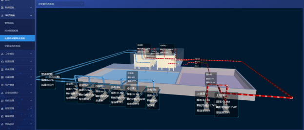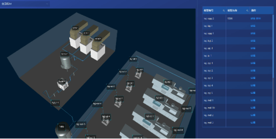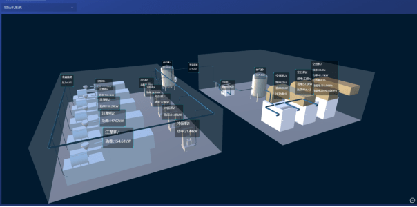项目需要监测空压机子系统,污水处理子系统,轧机冷却水循环系统,空调冷热水子系统。展示主要设备的日用能,月用能,关键设备的电参量,温度,频率等数据,通过3D模型展示。