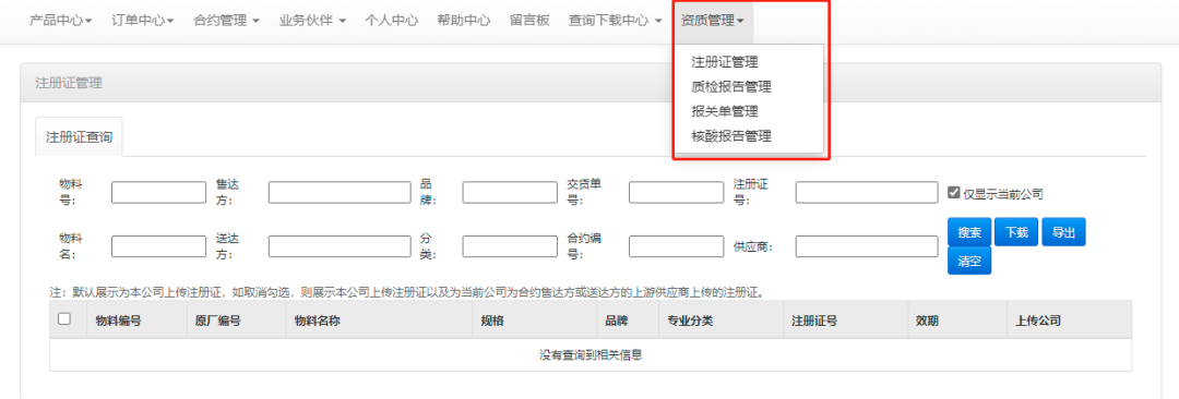 相关资质一键下载:可从多维度下载相关资质,包括根据交货信息合约信息一键下载对应注册证、质检报告等资质信息;