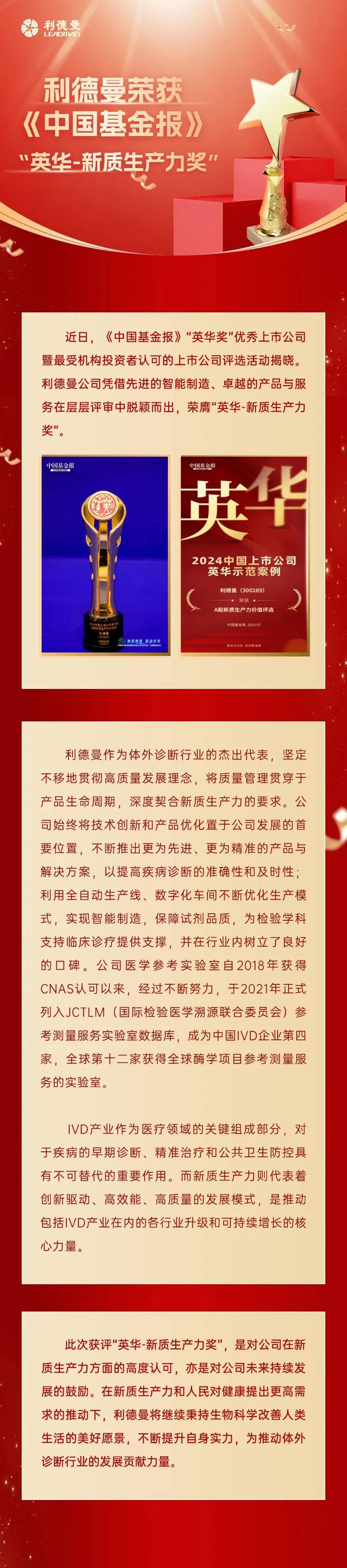 利德曼荣获《中国基金报》“英华-新质生产力奖”