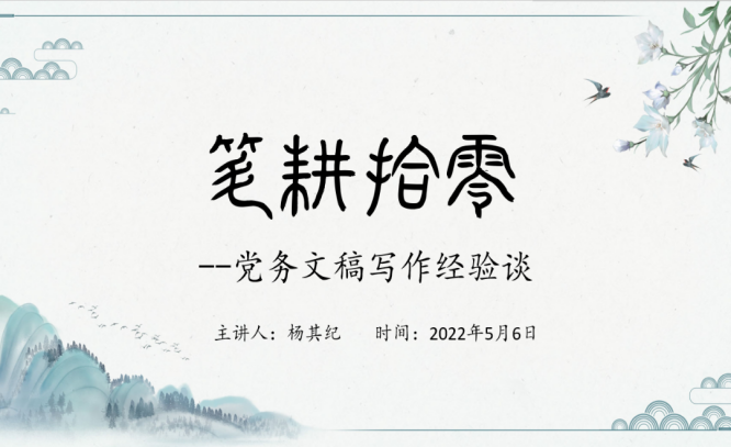 杨其纪老师结合自身写作经验和体会,分享了《笔耕拾零——党务文稿写作经验谈》。通过实际案例,深入浅出的讲解了“明确主题”、“收集素材”、“构思框架”、“填充内容”、“修改完善”等五步成稿法流程。最后他强调“文章不厌百回改”,要对大标题、小标题、行文顺序、内容文字等反复斟酌、打磨,使文章尽善尽美。