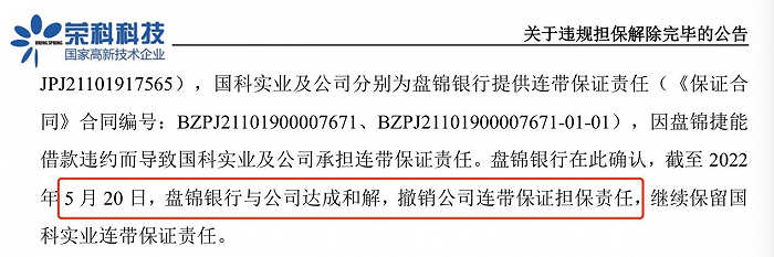 随着债务人盘锦捷能实业有限公司(简称“盘锦捷能”)拍卖抵押物抵债,荣科科技在5月27日前成功解除全部违规担保情况。
