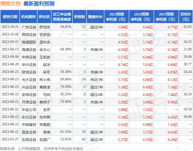 博雅生物2023年三季报显示,公司主营收入21.9亿元,同比上升5.17%;归母净利润4.64亿元,同比上升10.95%;扣非净利润3.61亿元,同比上升1.48%;其中2023年第三季度,公司单季度主营收入6.5亿元,同比下降5.04%;单季度归母净利润1.38亿元,同比下降0.93%;单季度扣非净利润1.04亿元,同比下降4.2%;负债率7.46%,投资收益4148.86万元,财务费用-2311.23万元,毛利率50.04%。