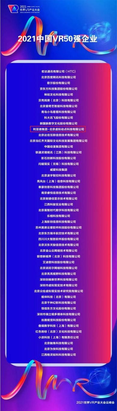 10月19日,2021世界VR产业大会云峰会在江西南昌举行,利亚德集团旗下北京虚拟动点强势入围“2021中国VR50强企业”榜单,并名列前茅,再一次证明了利亚德在VR领域的实力。据了解,全球视听科技领创者利亚德2017年开始强势布局VR产业,凭借全球领先的光学动作捕捉技术,持续推进VR的技术应用和产品开发,在多方面都取得了显著成果,并获得了行业内外一致认可。