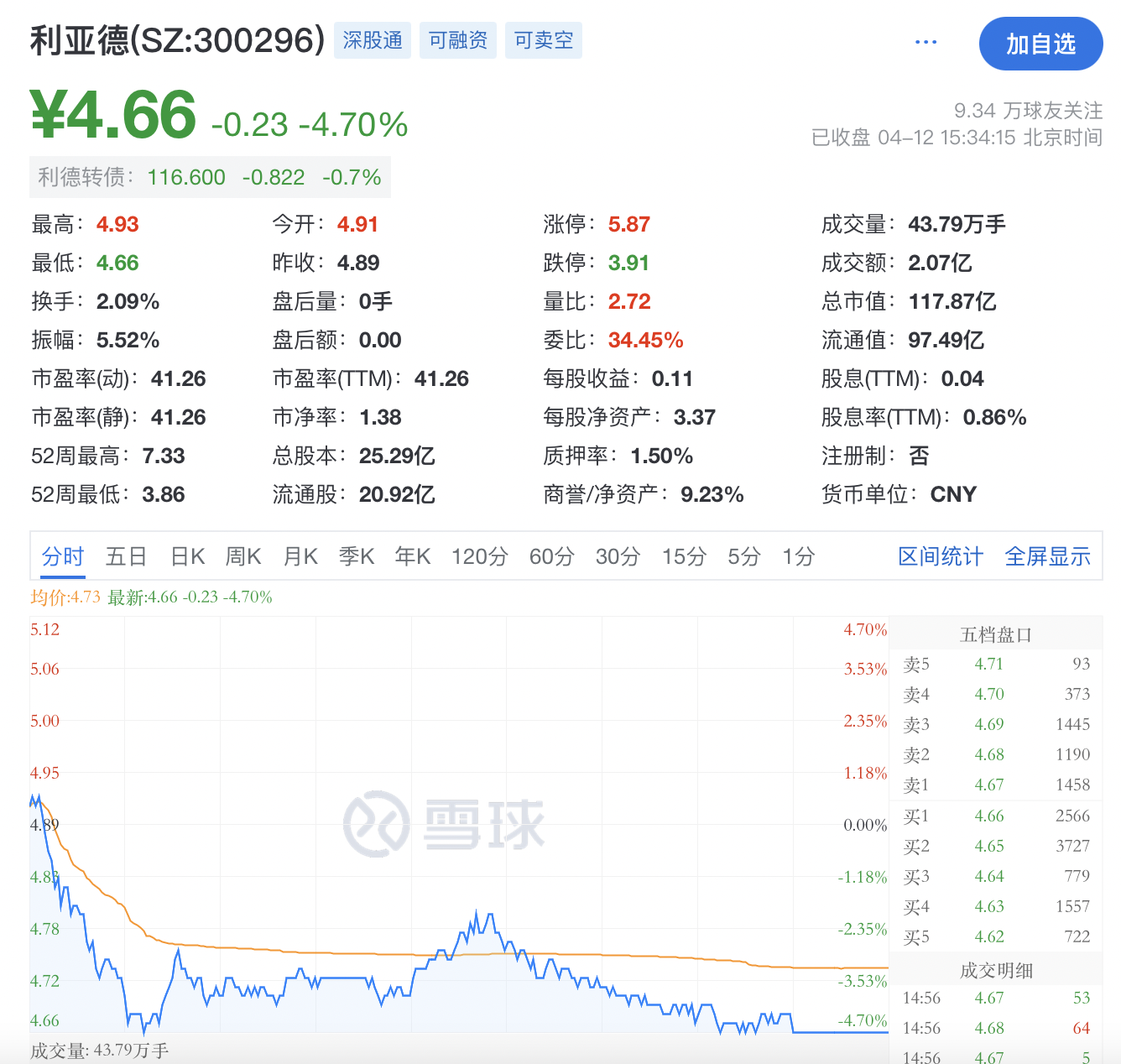 截至4月12日收盘,利亚德报4.66元,跌4.7%,总市值约117.87亿元。