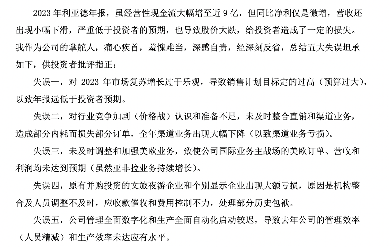 董事长李军表示,2023年利亚德年报,虽经营性现金流大幅增至近9亿,但同比净利仅是微增,营收还出现小幅下滑,严重低于投资者的预期,也导致股价大跌,给投资者造成了一定的损失。作为公司的掌舵人,痛心疾首,羞愧难当,深感自责,经深刻反省,总结五大失误。