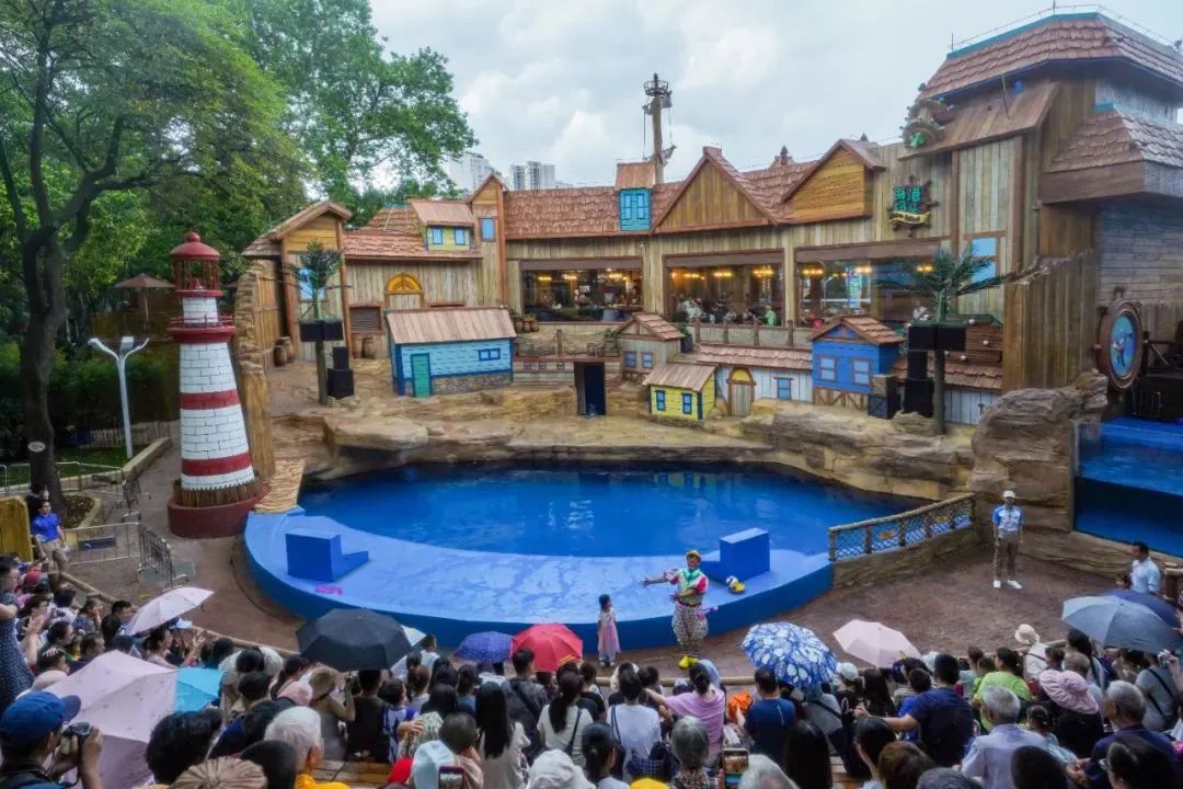 海狮表演剧场是一个充满童趣、缤纷、欢乐的以椰林海湾码头为主题打造的露天舞台。左右立体声及舞台返送音响为观众带来清晰、逼真的听觉体验。超低频音响与周围环境融为一体,营造出更加震撼的音效。灯光系统同样为表演增色添彩,温馨而舒适的灯光营造出如梦似幻的氛围。在这里,观众将与活泼的海狮、乖巧的海豹一同畅游沉浸在一片五彩斑斓的海洋世界中。