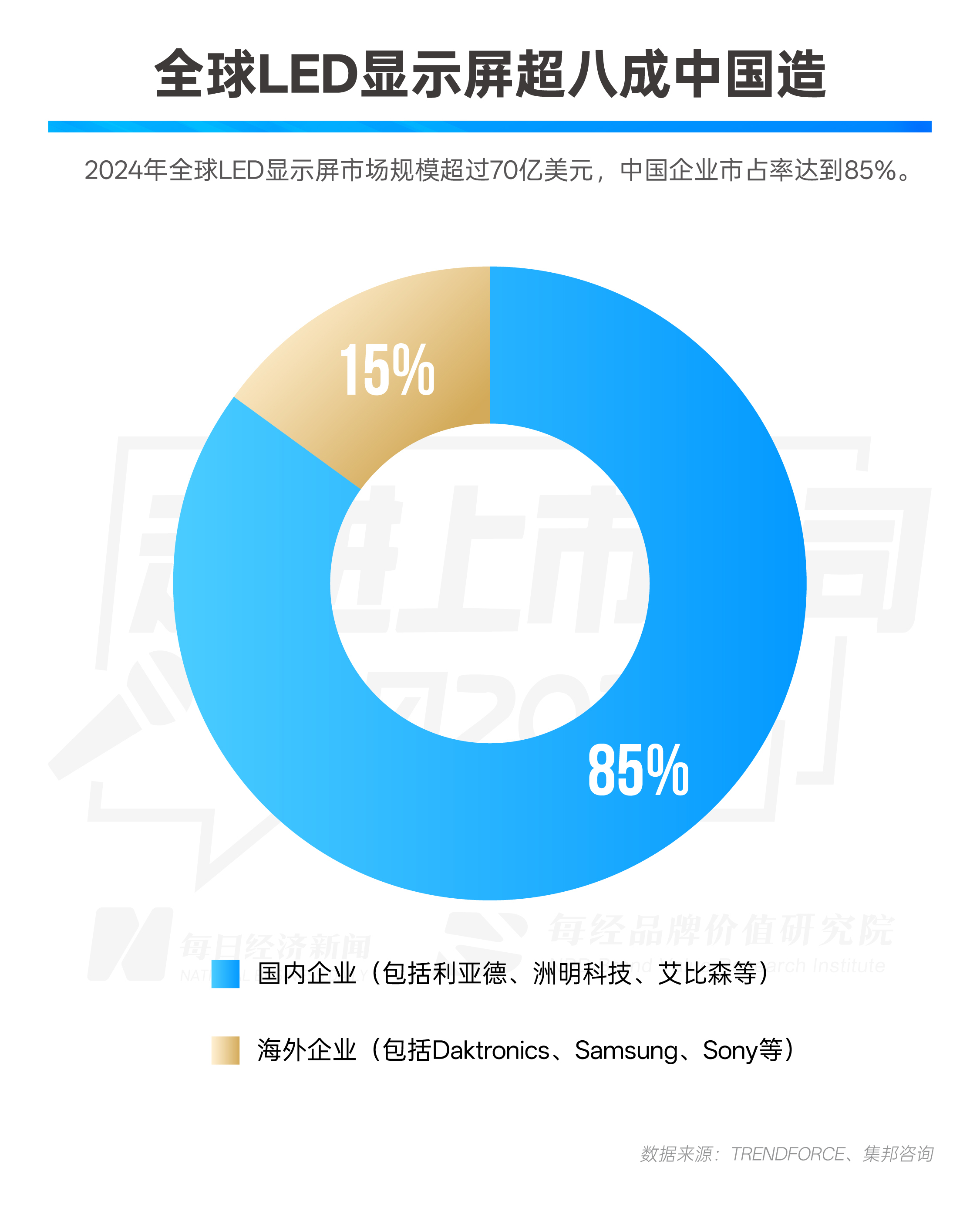 数据显示,作为全球最大的LED显示屏生产和消费国,中国LED显示屏已占据全球85%市场份额。