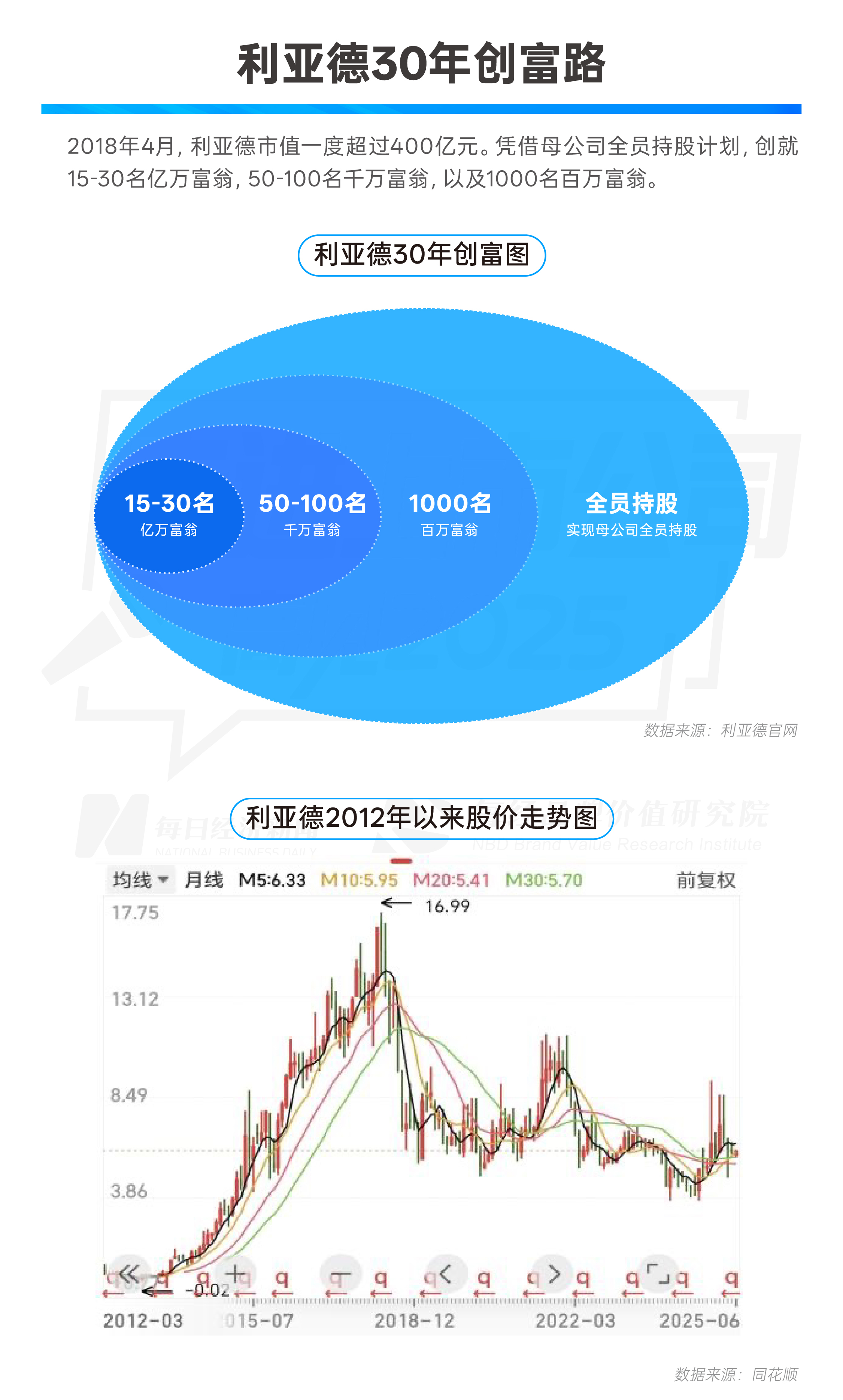 2018年4月,利亚德市值一度超过400亿元,凭借母公司全员持股计划,利亚德创造了15~30名亿万富翁、50~100名千万富翁以及1000名百万富翁??