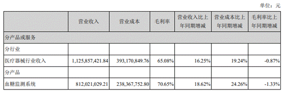 分行业来看,三诺生物医疗器械行业收入毛利率为65.08%,同比下降0.87%;分产品来看,血糖监测系统毛利率为70.65%,同比下降1.33%。