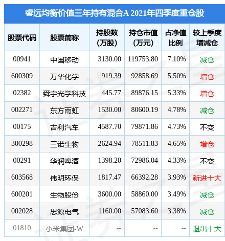 睿远均衡价值三年持有混合A的前十大重仓股如下: