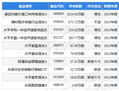 根据2021年报基金重仓股数据,重仓该股的基金共11家,其中持有数量最多的基金为睿远均衡价值三年持有混合A。睿远均衡价值三年持有混合A目前规模为150.87亿元,最新净值1.3683(3月22日),较上一日上涨1.43%,近一年下跌18.21%。该基金现任基金经理为赵枫。